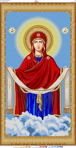 Картина для вишивки бісером ЕІ-05 Ексклюзивна ікона «Покрова Пресвятої Богородиці» Тканина : Габардин Загальний розмір : 86*161,2 см Розмір кольорової частини: 80*150 см Зашивка : часткова Кількість кольорів: 32 шт Загальна кількість бісеру: 264554 шт