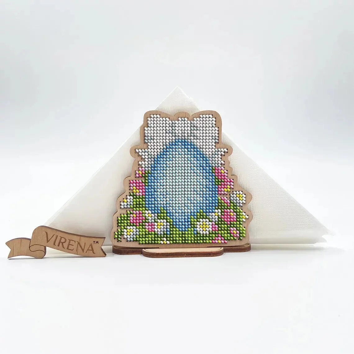 Придбавши серветницю ви отримаєте дві бічні стінки та основу, також серветниця комплектується фігурними фетровими пластинами для декорування звороту вишивки та вкладкою з надрукованою схемою (на вкладці зображена схема та розкладка бісеру)