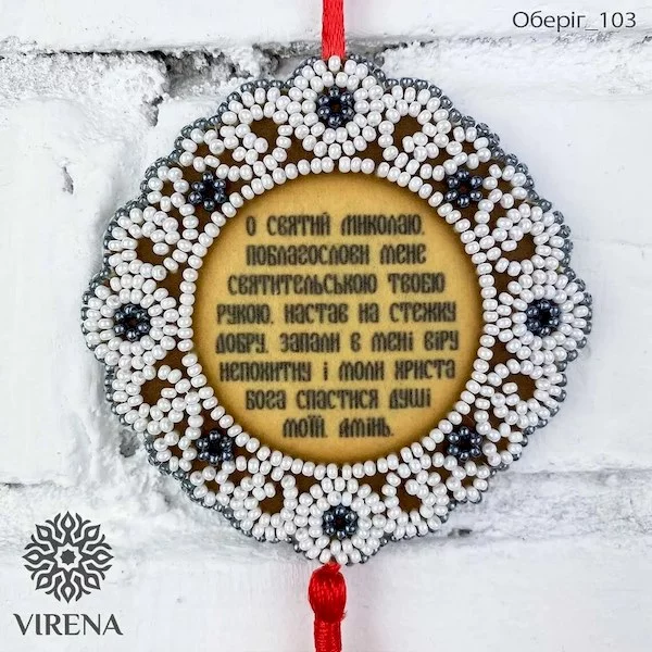 Схема оберегу нанесена на фетрову основу. З однієї сторони зображена ікона, а з іншої — молитва.