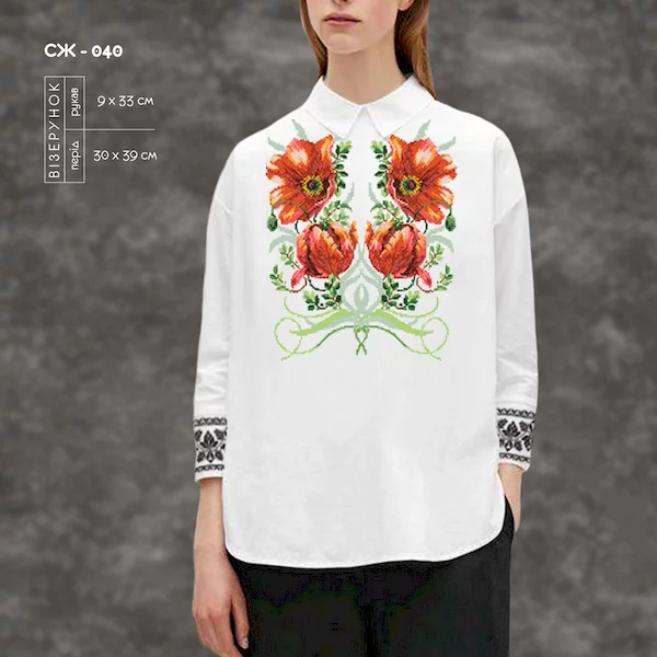 - на чорній (темній) тканині малюнок не наноситься. Малюнок друкується на водорозчинному флізеліні, який додається у комплект. Ціна заготовки не змінюється, але вишивати менш зручно.