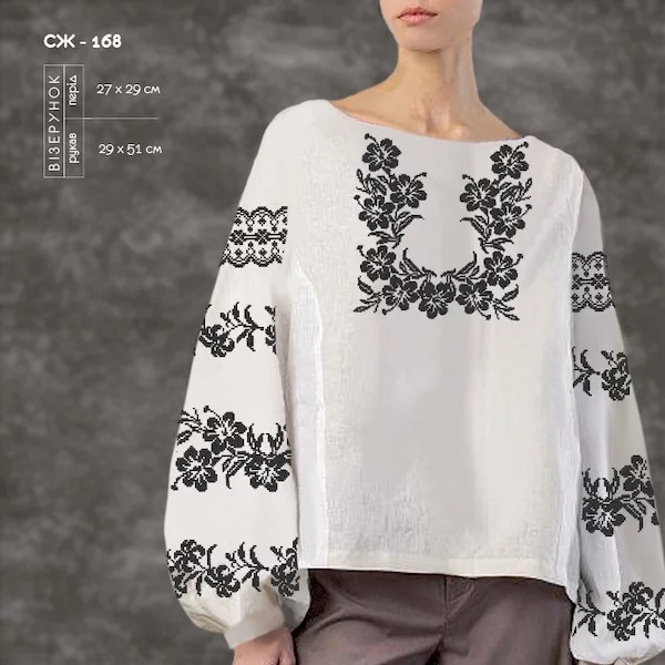- на чорній (темній) тканині малюнок не наноситься. Малюнок друкується на водорозчинному флізеліні, який додається у комплект. Ціна заготовки не змінюється, але вишивати менш зручно.