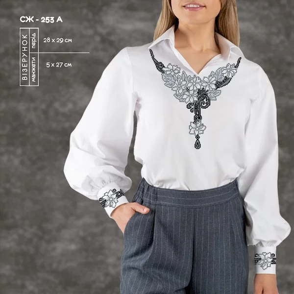 - на чорній (темній) тканині малюнок не наноситься. Малюнок друкується на водорозчинному флізеліні, який додається у комплект. Ціна заготовки не змінюється, але вишивати менш зручно.