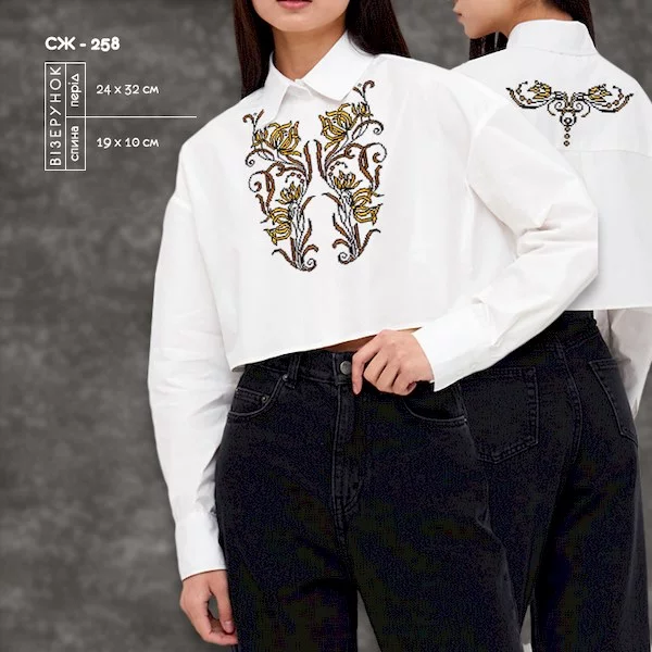 - на чорній (темній) тканині малюнок не наноситься. Малюнок друкується на водорозчинному флізеліні, який додається у комплект. Ціна заготовки не змінюється, але вишивати менш зручно.