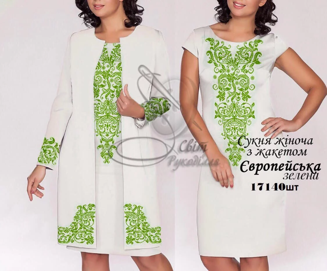 Заготовка під вишивку сукні з жакетом. Заготовка НЕ ПОШИТА і не розкроєна. Після вишивки ва потрібно буде самостійно розкроїти і сшити виріб за своїм розміром та фасоном. Розмір відрізків на заготовку: сукня - 75х115 см - 2 відрізки на перед і спинку (параметри для домотканого полотна 70х115 см), відрізки тканини на жакет 75х115 см на перед і спинку (домоткане 70х115 см), рукава 60х75 см - 2 відрізки (домоткане 60х70 см). На темних тканинах друку немає! (До тканини додається водорозчинний флізелін з надрукованою схемою). Будь ласка, в коментарях до замовлення вказуйте бажаний колір тканини.