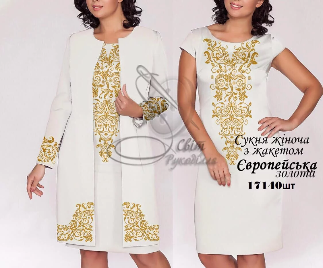 Заготовка під вишивку сукні з жакетом. Заготовка НЕ ПОШИТА і не розкроєна. Після вишивки ва потрібно буде самостійно розкроїти і сшити виріб за своїм розміром та фасоном. Розмір відрізків на заготовку: сукня - 75х115 см - 2 відрізки на перед і спинку (параметри для домотканого полотна 70х115 см), відрізки тканини на жакет 75х115 см на перед і спинку (домоткане 70х115 см), рукава 60х75 см - 2 відрізки (домоткане 60х70 см). На темних тканинах друку немає! (До тканини додається водорозчинний флізелін з надрукованою схемою). Будь ласка, в коментарях до замовлення вказуйте бажаний колір тканини.