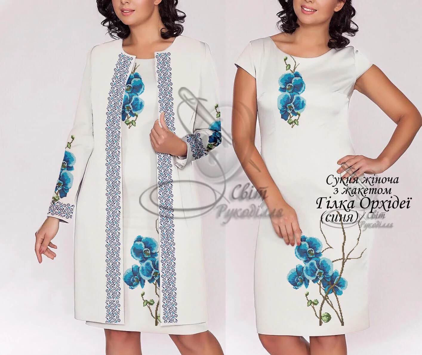 Заготовка під вишивку сукні з жакетом. Заготовка НЕ ПОШИТА і не розкроєна. Після вишивки ва потрібно буде самостійно розкроїти і сшити виріб за своїм розміром та фасоном. Розмір відрізків на заготовку: сукня - 75х115 см - 2 відрізки на перед і спинку (параметри для домотканого полотна 70х115 см), відрізки тканини на жакет 75х115 см на перед і спинку (домоткане 70х115 см), рукава 60х75 см - 2 відрізки (домоткане 60х70 см). На темних тканинах друку немає! (До тканини додається водорозчинний флізелін з надрукованою схемою). Будь ласка, в коментарях до замовлення вказуйте бажаний колір тканини.