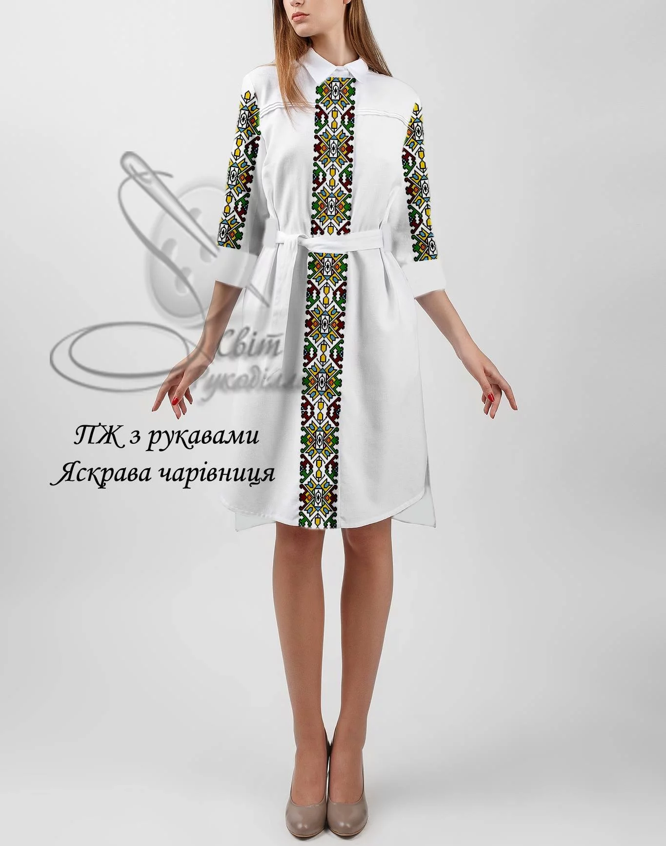 Заготовка під вишивку сукні. Заготовка НЕ ПОШИТА. Вона складається з прямокутних відрізків тканини, які після вишивки необхідно розкроїти та сшити по своєму фасону і розміру. Розміри відрізків на заготовку - 75х115 см - 2 шт (на перед і спинку) для габардину і 70х115 см -2 шт, для домотканого полотна. Відрізки тканини на рукава - 60х75 см - 2 шт, для габардину і 60х70 см - 2 шт, для домотканого полотна. На темних тканинах друку немає! (До тканини додається водорозчинний флізелін з надрукованою схемою). Будь ласка, в коментарях до замовлення вказуйте бажаний колір тканини.
