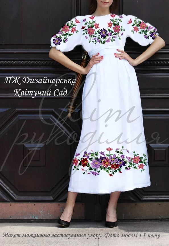 Заготовка під вишивку сукні. Заготовка НЕ ПОШИТА. Вона складається з прямокутних відрізків тканини, які після вишивки необхідно розкроїти та сшити по своєму фасону і розміру. Розміри відрізків на заготовку - верх - 75х80 см передня і задня частини, 60х75 см рукави; (домоткана: 70х80 та 60х70 відповідно), низ – 2 відрізка шириною 100см*довжиною 120см. На темних тканинах друку немає! (До тканини додається водорозчинний флізелін з надрукованою схемою). Будь ласка, в коментарях до замовлення вказуйте бажаний колір тканини.